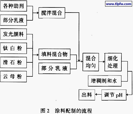(2)计量乳液,先将一定量的苯丙乳液放入一个烧杯中,然后分别计量各种助剂,再将除了消泡剂以外的助剂装入另一烧杯中,充分搅拌,形成混合助剂;将混合好的助剂缓缓加入到一半乳液之中,继续搅拌10min,待用:将称量好的发光颜料、钦白粉、滑石粉、云母粉放入空烧杯中,初步搅拌均匀后,加入另一半乳液,搅拌均匀,研磨细化处理:然后再将前面混合好的混合添加剂和乳液再次加入到研磨过的乳液和颜料、填料混合物中,持续搅拌30 rnin,加入ph调节剂,使ph达8一9,然后再加入水或增稠剂,调节薪度,过滤,制成发光涂料。将其试涂在板上,本试验采取接受太阳光和灯光照射一定时间,夜晚观察涂膜的发光亮度和发光持续的时间,配制浓度不同的数个配方,连续观察数日,调整并确定配方。涂料配制的流程见图2.