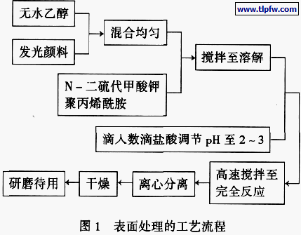 一般乳液用量为5%一30%的稀土金属铝酸盐发光涂料在使用中存在极性较大、耐水性差、在水中易水解而使发光亮度降低、寿命较短、与有机物相容性差、长时间放置会出现沉淀结块等缺点,从而限制了它的进一步应用。需要对材料进行表面改性或包覆处理,改变颜料的表面特性,提高产品的耐水性和耐候性,并改善发光颜料在涂料中的分散性、相容性。本试验中采用二硫代聚丙烯酞胺盐在酸性条件下发生反应生成的聚合物来包覆发光材料。表面处理的工艺流程见图1。