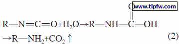 水性聚氨酯以水为分散介质,异氰酸根不可避免和水发生反应,见式(2)。这也是涂膜产生气泡的原因之一。