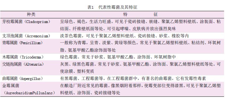 水性建筑涂料中由于富含微生物生长的营养成分,而微生物在自然界中又几乎无处不在,因而只要环境温度等适合微生物生存的环境条件存在,微生物便会大量繁殖,从而导致产品腐败变质而报废;另一方面,有些微生物还能在涂料施工后使涂膜的外表面变污,甚至使整个涂料逐步降解。因此在涂料中必须加入能阻止和抑制微生物生存的添加剂,这类助剂一般称为防霉杀菌剂。引起合成乳胶和涂料腐败的主要菌属是铜绿色假单细胞菌、大肠杆菌、阴沟肠杆菌、念珠小球菌、黄色八叠球菌、普通变形杆菌、荚膜红假单胞菌、乳酸链球菌、海生黄杆菌、覃状芽孢杆菌、金黄色葡萄球菌和枯草杆菌等。在涂装后可能会在涂膜上孳生的细菌微生物主要是霉菌,如黑曲菌、青霉、根霉等。霉菌种类很多,统一分类十分困难,但是可以按生活环境予以分类。日本曾对260个地方的内装修材料进行取样调查,其所取得的霉菌的代表性菌种的特征如表1 所示。其中,有的具有霉毒;有的可引起哮喘和皮肤病,且放出强烈臭味而危及人体。决定霉菌生存条件的因素有温度、水分、氧气、养分、酸碱度等五个主要因素。根据霉菌的生存条件和实际情况,可以确定霉菌在一般建筑物中易发生在下列部位:壁面较冷而易露的结构部位、多产生水蒸气的房间、空气流通不良的地方、难开孔洞且难于良好通风的设施、自然通风口及空调通风口的周围。因而,在上述建筑物的部位当需要用涂料涂饰时,应特别注意防霉问题。
