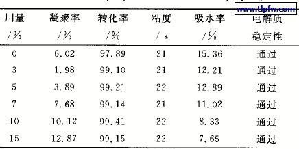由表1可知:乳化剂用量过少,反应转化率不够,反应稳定,性也不够,凝聚率较高。这是因为当乳化剂浓度低时,乳化剂不能将乳胶粒完全包裹,从而导致聚合体系不稳定,使凝聚现象加重,而且乳化剂用量少同时单体浓度足够时,反应速率与乳化剂浓度成正比,因而导致转化率低。随着乳化剂用量的增加,乳胶粒表面乳化剂的覆盖量增多,乳胶粒所具有的空间位阻作用和静电作用增强,使乳液的聚合稳定性提高,因而凝聚率下降。但乳化剂用量太多,体系生成的乳胶粒过多,乳胶粒界面能增大,单位面积如改乳化剂不足,同样导致凝聚率增大,且乳化剂用量过多,还会导致涂膜吸水率提高。综合平衡各因素,最佳的乳化剂用量为单体总量的4.5 ~6.0% 。