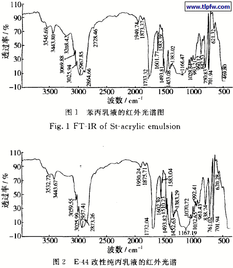 从图1、2的对比可以看到,二者的吸收峰基本一致,说明两者具有相似的基团结构。701.94cm-1 和760.83cm-1 为苯环中苯环的单取代特征峰。960.12cm-1 和993.21cm-1 是丙烯酸丁酯的特征峰[8]。1453.08cm-1。,1493.81cm-1。,1583.39cm -1和1601.77cm -1为苯环的特征峰。1733.32cm-1 为丙烯酸酯基中C=O 的伸缩振动峰。2957.85cm -1是一cH3、一cH2一的特征吸收峰。3443.80cm-1是O-H 键的伸缩振动吸收峰。可见加入的各单体均参加了共聚 。