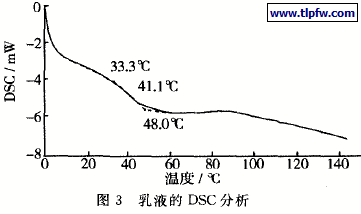 由图3可知:玻璃化转变的起始点为33.3℃ ,终止点为48.0℃ ,拐点为41.1。C。其中只有一个玻璃态转化温度,说明生成的聚合物为均相结构。