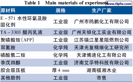 季戊四醇、磷酸氢二铵等易吸水材料使用前用溶剂型丙烯酸酯包裹处理。将计量的阻燃粉体和相关助剂放入适量的水中混合均匀,在砂磨机上研磨后,再加入计量的水性环氧乳液与胺固化剂( 质量比为1∶ 1) 和醋丙乳液,待研磨充分后出料,根据刷涂要求用水调节黏度。将其涂在打磨处理过的150 mm × 150 mm × 4 mm 木板上,每次涂0. 2 mm 厚左右,涂刷间隔1 d,涂5 次使木板涂层厚度为( 1 ± 0. 05) mm 左右,在35 ℃烘箱中鼓风烘干。