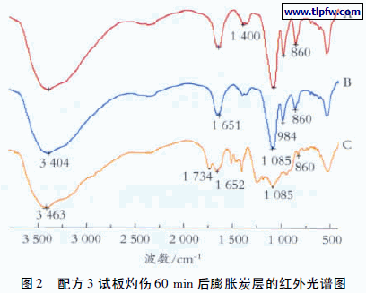 图2 配方3 试板灼伤60 min 后膨胀炭层的红外光谱图