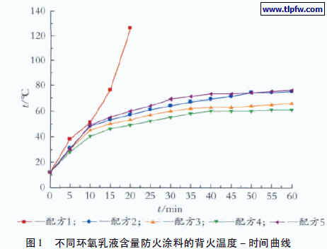 图1 是不同环氧乳液含量防火涂料的背火温度- 时间曲线。
