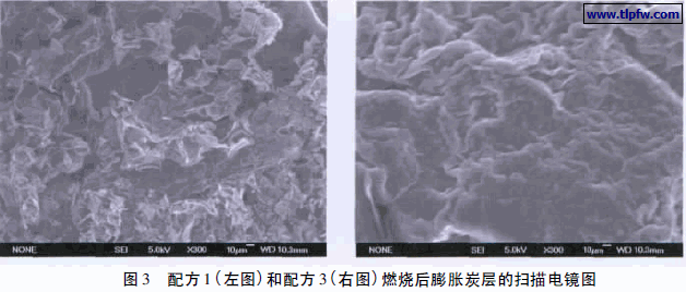 图3 为配方1( 不含环氧乳液) 和配方3( 加入6% 环氧乳液) 燃烧后的膨胀炭层电镜图。