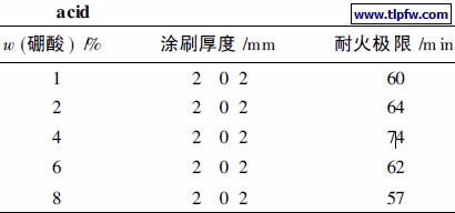 表1为不同硼酸含量的涂料的耐火极限。