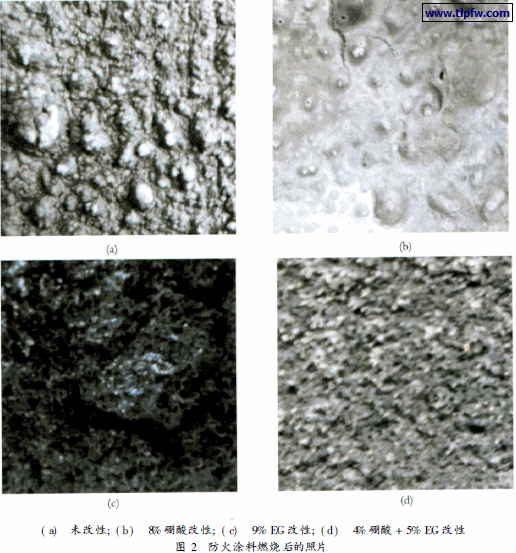 由表3可以看出, EG改性的涂料要比硼酸改性的涂料的分解温度高, 而EG /硼酸改性的涂料的分解温度在上述两者之间; EG /硼酸改性的防火涂料在700 时最终的残炭量是44%, 比EG改性和硼酸改性的防火涂料都有较大的提高; 这是因为EG比硼酸的分解温度高, 硼酸受热分解成B2O3 有效地提高了残炭量, 可见硼酸/EG 可以起到协同改性防火涂料性能的作用。