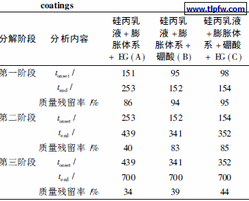 如图3所示, 防火涂料( A) 、( B) 和( C ) 共有3个分解阶段, 其详细分解情况, 见表3。