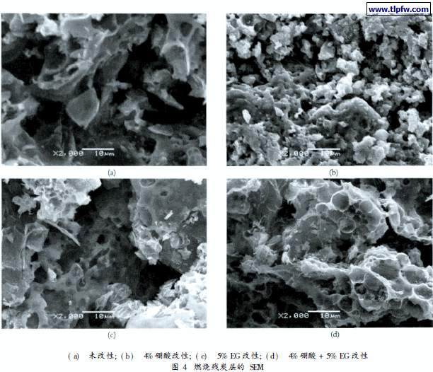 从图4可以看出, 未改性涂料的残炭层质地疏松、孔洞较大; w (硼酸) = 4%改性涂料的残炭层骨架致密, 但是没有形成较大的孔洞, 不能有效提高耐火极限; 添加w ( EG) = 5%的涂料燃烧后的残炭层, 虽然获得了较疏松的膨胀层, 但炭层骨架疏松, 力学性能稍显不足; 而同时用w (硼酸) = 4%, w ( EG) =5%改性涂料的残炭层在获得致密的骨架结构的同时, 又形成了均匀的蜂窝状结构, 有效地提高防火涂料的耐火极限。