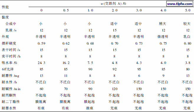 水性聚氨酯合成时多使用二羟甲基丙酸这样的强亲水性化合物, 聚合所得的分散体多为一种线性结构的聚合物, 所以膜的强度往往较差, 耐水性低, 耐碱、耐溶剂性也不好。为了克服这些缺点采用交联法以改变分子结构是目前多数研究者所采用的方法。交联可分为两大类: 分子内交联和外加交联剂交联, 后者往往是双组分体系, 使用时不大方便。分子内交联已引起很多研究者的兴趣, 目前市场产品多为酮羰基/酰肼法交联。经市场检验, 仍达不到消费者需求。本实验采用自制的交联剂A对水性聚氨酯进行分子内交联取得了较好的效果。表2为自制交联剂A对产品性能的影响。