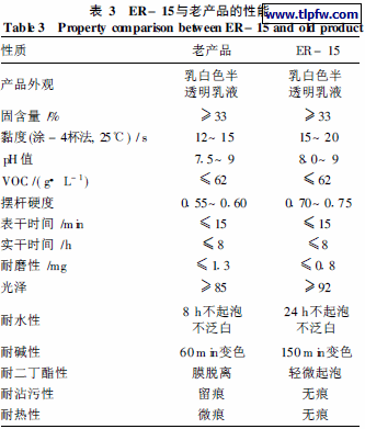 目前, 世界合成木器漆树脂发展的趋势表现为环保和高性能化, 随着国家对环保法规的日趋严格, 水性木器漆将逐步取代油性漆。20世纪80年代, 水性丙烯酸聚氨酯( PUA) 产品已应用于木器漆上, 我国水性漆起步较晚, 自主研发的产品尽管已商品化, 但其在耐磨、耐化学性等方面的缺点仍限制了其应用范围, 大部分水性漆仍局限于装饰漆。因此, 提高水性PUA树脂的性能成为国内水性漆发展的关键所在。本实验在水性PUA 上引入特殊的官能团, 合成出了高性能的水性PUA 树脂ER- 15。