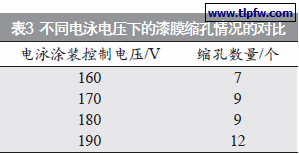 在试验室采用G958-9前处理材料和KNT831LF系列电泳漆,通过调整涂装电压进行试验,观察漆膜表面的缩孔状态,试验结果见表3。