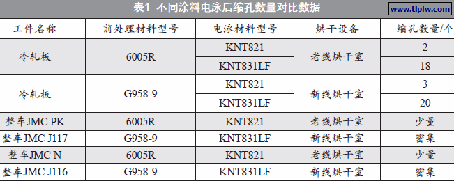 首先分析所采用的电泳漆。新涂装线选用的是上海金力泰KNT831LF系列的电泳漆,老涂装线选用的是KNT821系列的电泳漆,两种电泳漆涂装工件后所产生的缩孔数量有明显的不同,采用试板进行分组对比试验的结果见表1。
