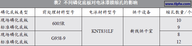 不同前处理材料制备的磷化底板采用KNT831LF系列涂料进行电泳涂装试验,其试验结果见表2。