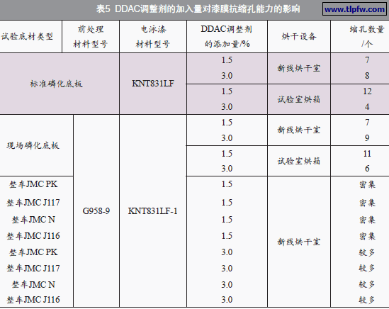 首先从涂料原因出发,电泳漆对新生产线的适应需要一定的时间,因自身抗缩孔能力不强必定会延长磨合期。从现场情况分析,要想尽快解决缩孔问题必须提高电泳漆的自身抗缩孔能力, 供应商临时调整部分电泳漆,用新调整的电泳漆KNT831LF-1替换部分原电泳槽中的电泳漆KNT831LF,从而一定程度上减少了电泳漆整体的污染程度;替换完成后再向槽体中加入一定量的DDAC调整剂(主要成分为环氧树脂、十二烯基琥珀酸酐、辛基缩水甘油醚等),以增强电泳漆的抗缩孔能力,从表5可见,通过控制调整剂加入量,缩孔情况有一定程度的改善。