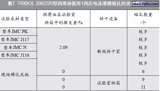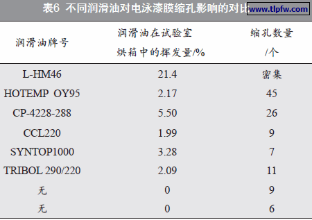 基于烘烤状态对缩孔的产生有非常明显的影响,因此在试验室采用标准磷化底板和KNT831LF系列电泳漆,在试验室的烘干箱内对通过烘干室内部的输送链用润滑油和烘干室外部的输送链用润滑油进行取样和测试,对比结果见表6。