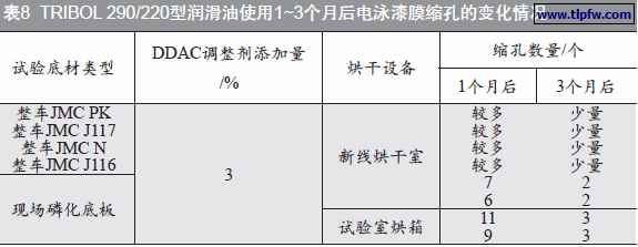 由表7看出,在更换润滑油后的第1周,缩孔情况变化并不明显,经1~3个月的调整后,漆膜表面缩孔变化情况见表8。