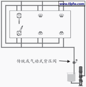 由于目前我国很多大型涂装线的供漆系统均采用液压泵,因而在此介绍一下两种泵在配备供漆系统方面的区别,如表1 所示。对于如图4 所示的水性涂料二线制循环系统:当采用液压泵供漆时,仅能通过手动调节背压阀来调整系统压力,系统的流量通过液压泵的打击数来控制。系统不能在非生产时间降至最低的流速。当采用电动泵供漆时,可通过控制电信号驱动气动式背压阀,从而调节供漆系统的压力,同时系统需配备压力传感器,监控循环系统的工作压力。这样通过与生产设备联锁信号来变频调节电动泵的输出流量,做到“实时”检测、调节和控制。