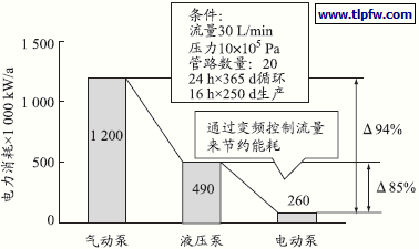 根据表1 的比较可见,对于配套一套水性涂料的二线制循环系统,液压泵供漆系统与电动泵供漆系统的设备配置有所不同,价格上电动泵的供漆系统略高出5%左右。但对于能耗而言,如图5 所示,当应用于水性涂料供漆系统时,由于电动泵系统所具备的与涂装设备及生产线同步、变频控制流量的特性,系统电能消耗大幅降低,同时可降低设备的负载,延长设备使用寿命。