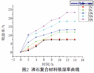 图2为不同量沸石复合材料的吸湿率随时间变化曲线,由图2可知,沸石复合材料的吸湿性能随氯化钙的含量升高而升高,吸湿14 h后,氯化钙浓度为30%的吸湿率为23.4%,20%的吸湿率为18.2%,10%的吸湿率为13.3%,5%的吸湿率为11.9%,1%的吸湿率为7.7%,不加氯化钙的沸石的吸湿率为7.4%,但当氯化钙溶液浓度为30%时,沸石复合材料吸湿量过大,导致沸石表面出现液态水层,故不适合用作涂料。而含氯化钙浓度为20%的吸湿能力比较理想。