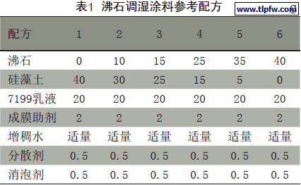 以含20%氯化钙的组装沸石、硅藻土、乳胶漆为原料,按配方配制成涂料。涂料配方如表1。
