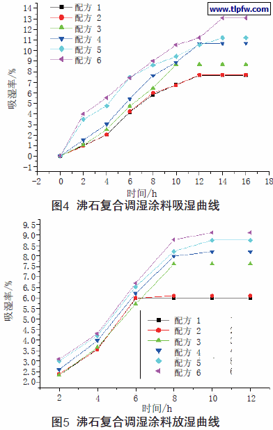 综合以上对不同配方涂料的吸湿、放湿性能的测定,配方6的吸湿、放湿性更具有优越性。