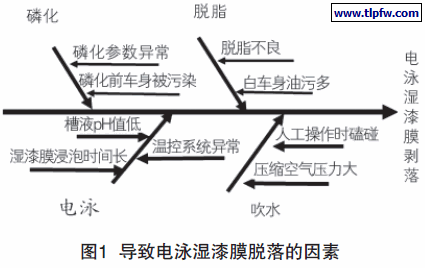 针对上述问题,进行逐工序排查后,对导致电泳湿漆膜脱落的因素进行了分析,见图1。