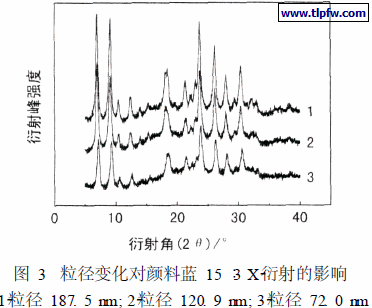 图3 是粒径分别为72. 0 nm、120. 9 nm 和187. 5 nm的颜料蓝15 ∶3涂料粉体的X2衍射曲线。对比有机颜料索引卡标准X2衍射图谱可知,本试验方法制备的涂料色浆中,颜料蓝15 ∶3的晶体结构为β型晶体,且涂料粒径对其的晶体结构影响不大。