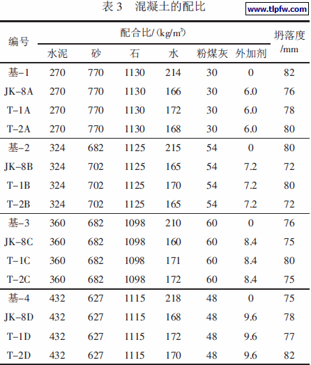 水泥:昆钢集团有限公司生产的P·O42.5 普通硅酸盐水泥;粉煤灰:阳宗海电厂Ⅱ级粉煤灰;砂:云南元谋生产的河砂,Ⅱ区中砂,细度模数2.5;碎石:昆明西山石料厂生产的碎石,5~20 mm 连续级配;减水剂:昆明超浩建材公司生产萘系减水剂;T-1 型外加剂、T-2 型外加剂;JK-8 复合防腐剂;拌合水:自来水。混凝土配比见表3。