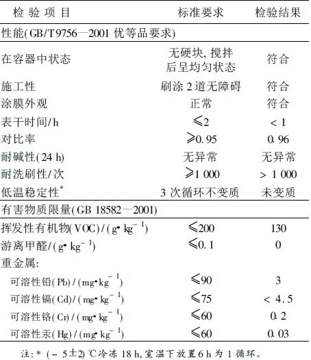 经安徽省产品质量监督检验所检测, 灰钙粉内墙乳胶漆的物理性能和有害物质限量如表2 所示。