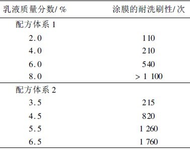 保持涂料配方中各组分的用量( 质量分数) 不变,而改变VAE 乳液的用量, 得到的涂膜耐洗刷性试验结果如表3 所示