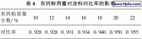 灰钙粉作为活性填料, 除了能够赋予涂料耐水性和耐洗刷性外, 与重质碳酸钙这类惰性填料相比, 还能够显著增大干涂膜的对比率( 遮盖力) 。当保持涂料其他组分不变时, 灰钙粉用量不同时涂料的对比率如表4 所示。表中所设计的灰钙粉用量试验范围是考虑到灰钙粉可能在涂料中的用量范围这一实际情况出发而得。试验时, 在灰钙粉用量增大的同时减少等量重质碳酸钙的用量, 以保持涂料中颜料、填料的总用量为49% ( 质量分数) 不变。从表中可以看出,当灰钙粉的用量从10% 增加到22% ( 即用12% 的灰钙粉代替等量的重质碳酸钙) , 可以使涂料的对比率从0. 928 提高到0. 955。