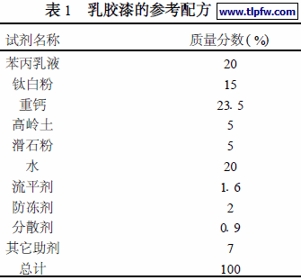 乳胶漆是以合成树脂借助乳化剂的作用,以0.1 —0.5μm 的极细微粒分散于水中构成乳液,并以乳液为主要成膜物质,加入适量的颜料、填料、辅助材料,经研磨而成的涂料。它以水为稀释剂,价格较便宜,具有无毒、不燃、施工方便、维修容易、色彩丰富及使用期长等优点,是一种性能十分优异的涂料[1 – 4 ] 。目前,我国内墙乳胶漆的品种繁多,但其中一些乳胶漆在生产、施工和应用过程中会散发出大量有害物质,对人体健康产生不利影响[5 、6 ] 。在市场方面,中高档内墙乳胶漆产品几乎都被Nippon 、ICI 等国外商家所占领。因此,研究开发环保、低价、优质的内墙乳胶漆,对振兴民族产业,实现建筑内墙涂料的可持续发展具有重要的现实意义。本研究旨在讨论合成乳胶漆所用的各种原辅料的种类和含量与涂料性能之间的关系。在性能一定的条件下如何降低乳胶漆的成本及有害物质含量,设计出中档、环保优质的内墙乳胶漆的较佳配方。