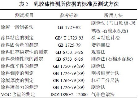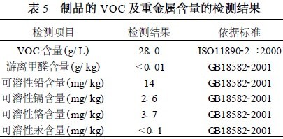 涂料的毒性危害主要来自三个方面: VOC(Volatile Organic Compounds , 挥发性有机化合物) 、游离甲醛、重金属[11 ] 。VOC 会影响人的中枢神经系统和免疫功能,引起头痛、疲劳、注意力不集中等症状[12 ] 。有机溶剂会挥发至空中而引起污染,以水为溶剂的乳胶漆基本上不存在这一问题。对于乳胶漆来说, VOC 主要来自于乳液[ 11 ] 、成膜助剂[13 ] 、p H 值调节剂[14 ] 等。为了降低乳胶漆中的VOC ,本研究选用不需要成膜助剂就能够成膜的苯丙乳液,且乳液中的残存单体浓度极低[8 ] ;助剂选用非矿物油类消泡剂;选取不含有有机溶剂的增稠剂和p H 值调节剂;选用不含甲醛的防腐杀菌剂;选用高纯度的无机颜、填料,从而减少了涂料中游离甲醛和重金属的含量。国家强制标准“室内装饰装修材料内墙涂料中有害物质限量”中规定,VOC 的最高限量是200g/ L ,游离甲醛是0.1g/ kg。表5 为本研究合成的乳胶漆有害物质含量的检测结果。从表5中可看出,制品完全符合国家的强制标准,且VOC含量仅为28g/ L 。