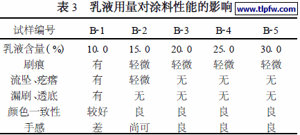 目前,国内外所用的合成树脂乳液主要有:聚酯酸乙烯乳液、醋酸乙烯2丙烯酸酯共聚乳液、苯乙烯-丙烯酸酯共聚乳液(苯丙乳液) 、纯丙烯酸酯共聚乳液等[7 、8 ] 。由于苯丙乳液具有十分优异的涂膜物理性质,耐水性、耐酸碱等化学物质的腐蚀性和耐紫外线的降解性等性能也十分优良,已成为内墙涂料中所用的主流乳液[ 9 ] 。其合成工艺已相当成熟,市场较为完善,性价比高,故被选为本研究所用乳液。表3 为仅改变苯丙乳液的含量所合成的乳胶漆的一些性能参数的对比。结果表明:乳液用量在小于15 %的情况下,漆膜会有刷痕,有流坠和疙瘩,而且出现漏刷透底现象,手感较差,表面粗糙,满足不了乳胶漆的美观装饰效果。乳液用量大于25 % ,涂料的各种施工性能没有太大变化,而涂料的成本却由于乳液用量的增大而提高了许多。因此,乳液在涂料配方中的较佳含量应控制在15 —25 %