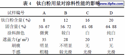 钛白粉是一种性能十分优异的颜料,它白度特别高,遮盖力、消色力高,耐候性比较好,成为涂料生产中必不可少的白色颜料品种[10 ] 。但是,钛白粉是一种价格相对较高的无机颜料,它的相对含量将直接影响到涂料的成本及产品的经济效益。因此,适当地减少钛白粉的含量而又不使涂料性能指标降低,这一问题就显得相当关键。表4 为仅改变钛白粉含量所制备乳胶漆试样的性能指标。结果表明:钛白粉的用量越低,涂料的白度越差,涂膜的遮盖力越差;反之,钛白粉用量越高,则涂膜白度、遮盖力、手感都会相应提高。但钛白粉用量提高,则会使涂料的成本大幅提高,实验结果表明钛白粉含量控制在15 %左右,涂料的性价比最高。