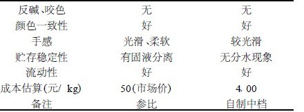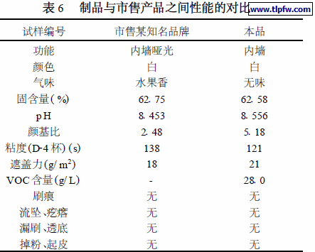 从表6 可看出,自行研制的产品其固含量高达60 %以上,并且在涂刷性能、遮盖力、条件粘度以及贮存稳定性、VOC 含量等方面已达到同行业的较高水平,而且成本低廉,是一种性价比较高的内墙乳胶漆。