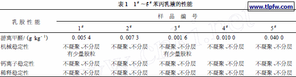 游离甲醛的检测按GB/ T 18582 —2001 附录B进行;乳液机械稳定性检测方法:搅拌1 h ,观察乳液变化;钙离子稳定性检测方法:5 %CaCl2 溶液与乳液以1 ∶5 (质量比) 混合,静置48 h ,观察乳液变化;稀释稳定性检测方法: 去离子水∶乳液= 5 ∶1 混合,放置48 h ,观察乳液变化。具体检测结果如表1 。