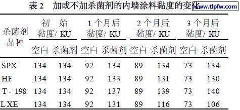 添加杀菌剂是为了有效地杀灭乳胶漆生产和储存过程中的微生物菌类,以保证乳胶漆的使用性和储存稳定性。通常选择气味低、储存不黄变、耐碱性好、广谱杀菌效率高的杀菌剂,如英国索尔公司、美国Troy 公司、美国罗门哈斯公司生产的牌号为SPX、HF、LXE、T – 198 等品种。在2 %HBR250 羟乙基纤维素水溶液中,分别加入0. 1 %的以上4 种杀菌剂,和不加杀菌剂的溶液相比较,在50 ℃恒温箱中储存3 个月,观察其黏度变化,结果见表2 。
