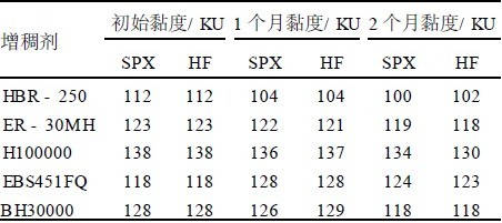 选用羟乙基纤维素增稠剂HBR – 250 、ER -30MH、EBS451FQ、H100000 和BH30000 , 配制2 %水溶液,每种产品分别加入SPX 和HF 杀菌剂0.1 % ,用斯托默黏度计测定黏度,储存于50 ℃恒温箱中2 个月,测定黏度变化,结果见表3 。