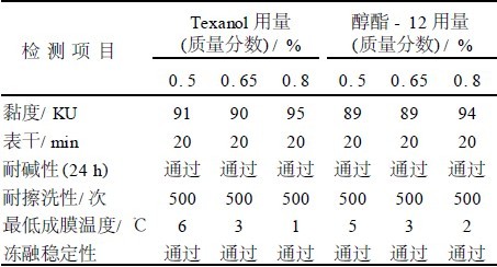 通过选择2 种不同类型的成膜助剂,以3 种不同比例配漆,比较其理化性能指标。从试验结果可以看出,成膜助剂Texanol 与醇酯- 12 在作用上相似,都可以选用。其添加量增加,成膜温度都有下降,从环保考虑,添加量在0. 5 %时,成膜温度在5~6 ℃,已达到内墙涂料使用要求。