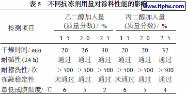 在PVC、乳液、颜填料和助剂相同的情况下,加入不同比例的乙二醇和丙二醇,比较其理化性能,结果见表5 。