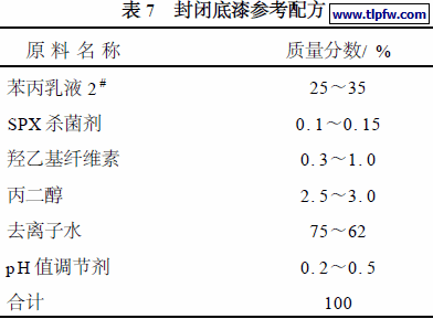 配制封闭底漆要选择粒径小的乳液,因其渗透性、封闭性较好。参考配方如表7 。