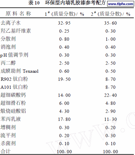 经过一系列乳液、助剂的选择,环保型内墙乳胶漆按不同PVC 配制。其参考配方列于表10 。