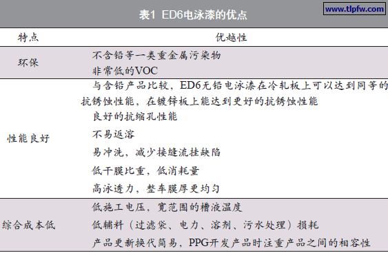 随着环保要求的日益提高,目前国内很多汽车制造厂都已使用了环保型无铅电泳漆。南京菲亚特汽车有限公司在推进清洁生产的过程中,将以ED6环保无铅电泳漆代替含铅的ED5电泳漆列为一项重要的工作。表1列出了PPG公司ED6第6代电泳漆的优点。