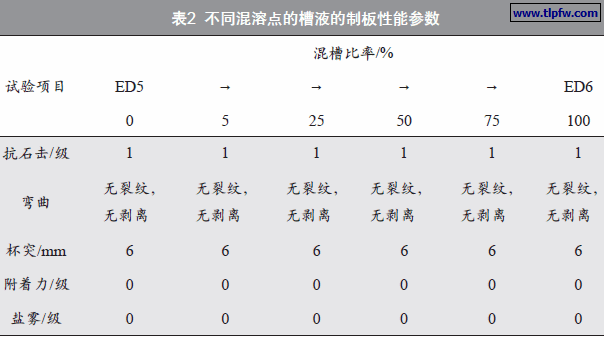试验室混槽试验的目的是验证ED6和ED5混溶的可行性,并考察在混槽过程中漆膜性能是否满足产品质量要求。试验筛选出6个混合比例点,制板试验数据见表2,槽液参数变化见图1和图2。