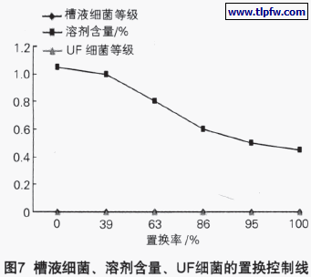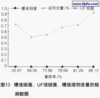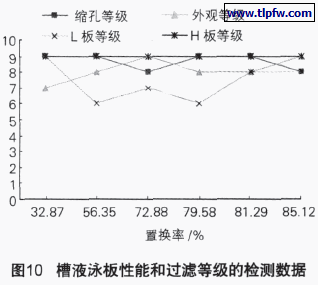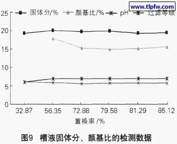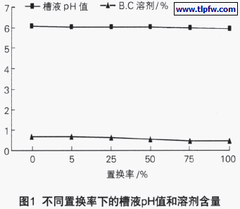 置换率为30%~60%时是槽液置换的关键期。当在某一置换点出现漆膜弊病时,可暂停加料,以使槽液固体分下降到工艺范围下限,然后增加投料量使槽液固体分陡然升高,从而跳过有问题的置换点。在实际置换过程中,应根据槽液参数变化情况随时进行调整。ED5槽液用醋酸调整pH值,从混槽转换开始,采用ED6使用的乳酸和氨基磺酸调整槽液的pH值。ED6电泳漆的树脂与颜料的加料比为8:1,与ED5电泳漆的树脂与颜料的加料比为4:1相比,有很大变化。