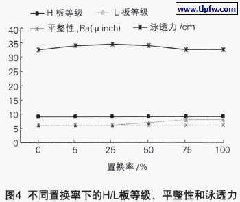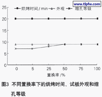 试板在各混合比例点的烘烤时间、电泳漆膜膜厚和漆膜缩孔等级如图3所示。试板在各混合比例点的H/L板等级和平整性、泳透力如图4所示。
